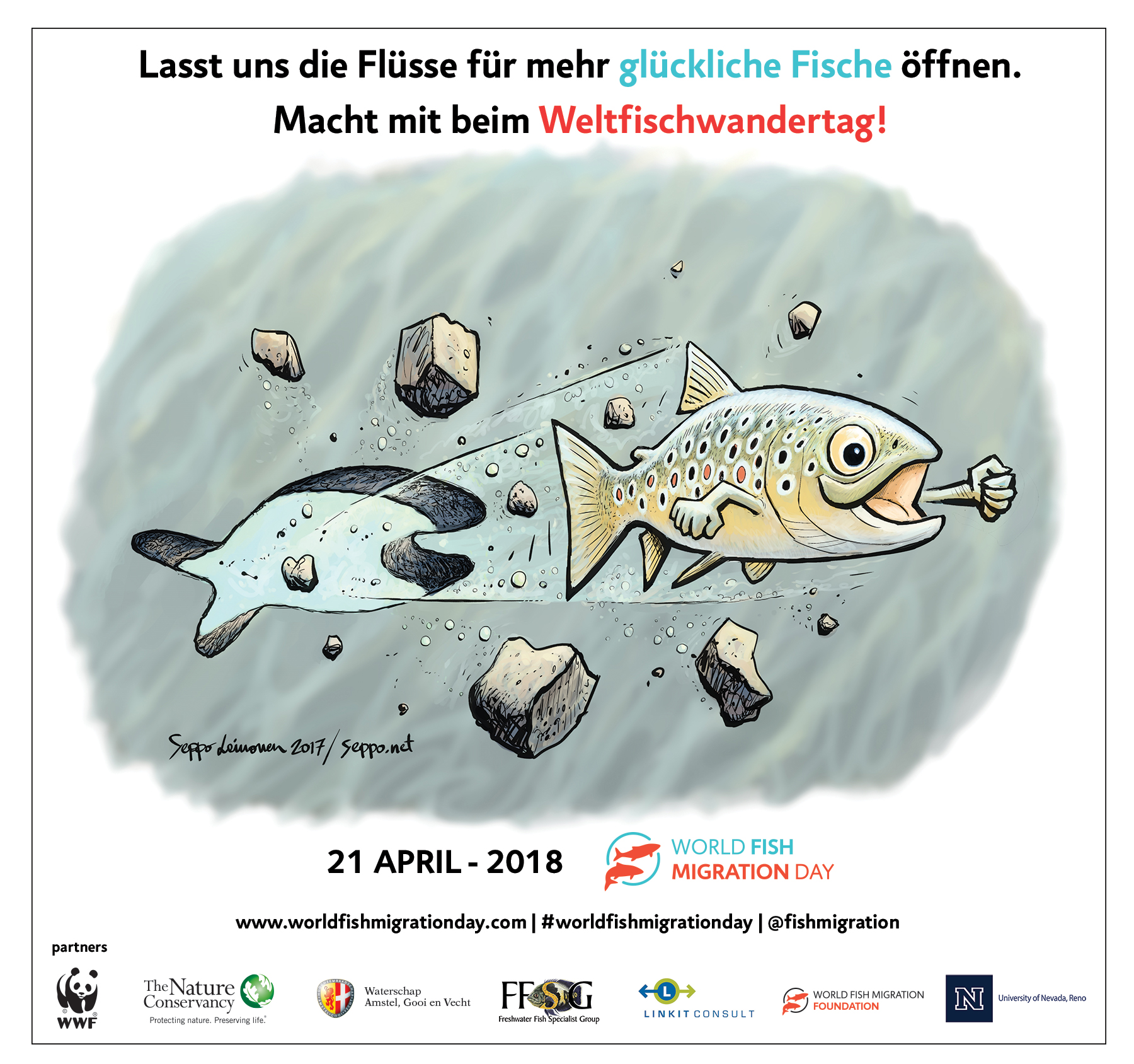 Fische, Flüsse und Menschen verbinden! Der World Fish Migration Day (Weltwanderfischtag) ist ein jährliches, global-lokales Event um Bewusstsein für die Wichtigkeit freier Flüsse und  Wanderfische zu schaffen. Der nächste Weltwanderfischtag ist am 21. April 2018. Wirst auch du teilnehmen? Registriere deinen Event! Finde auch das Video und die Broschüre.