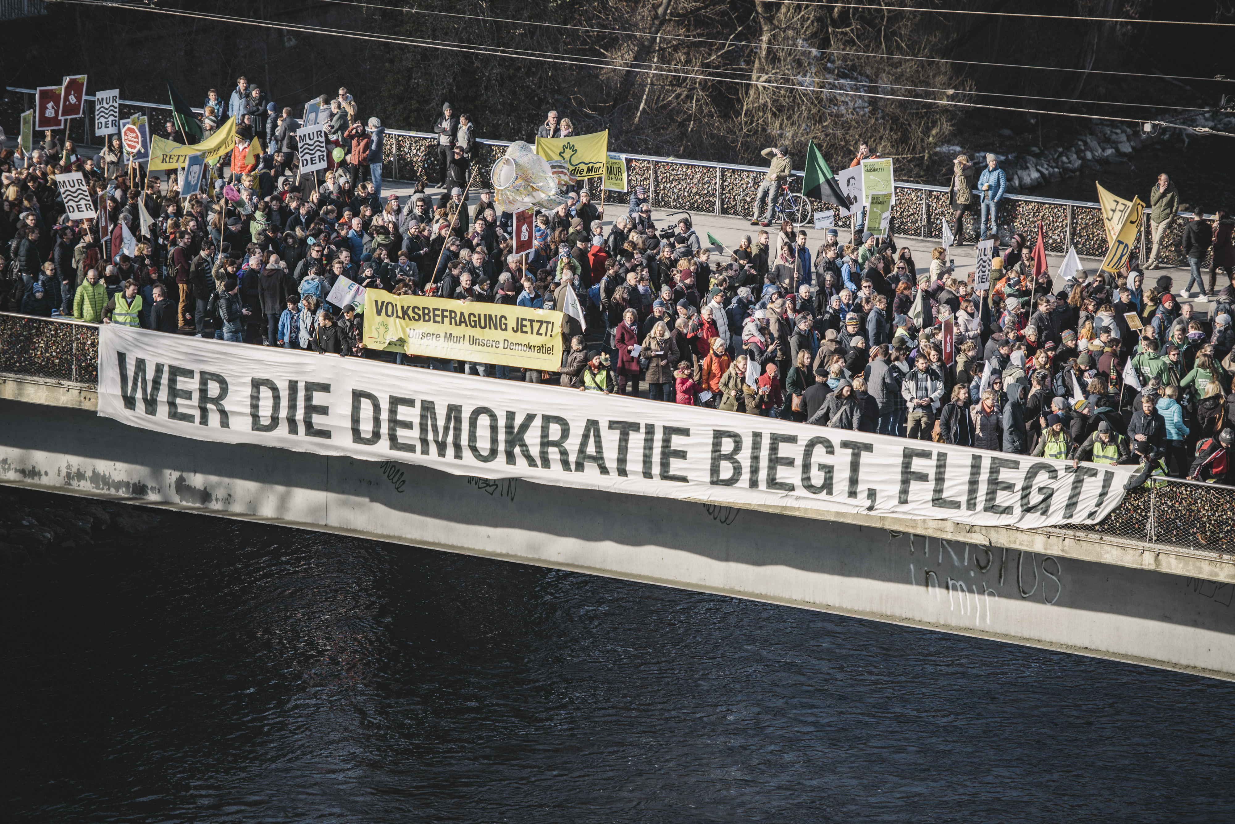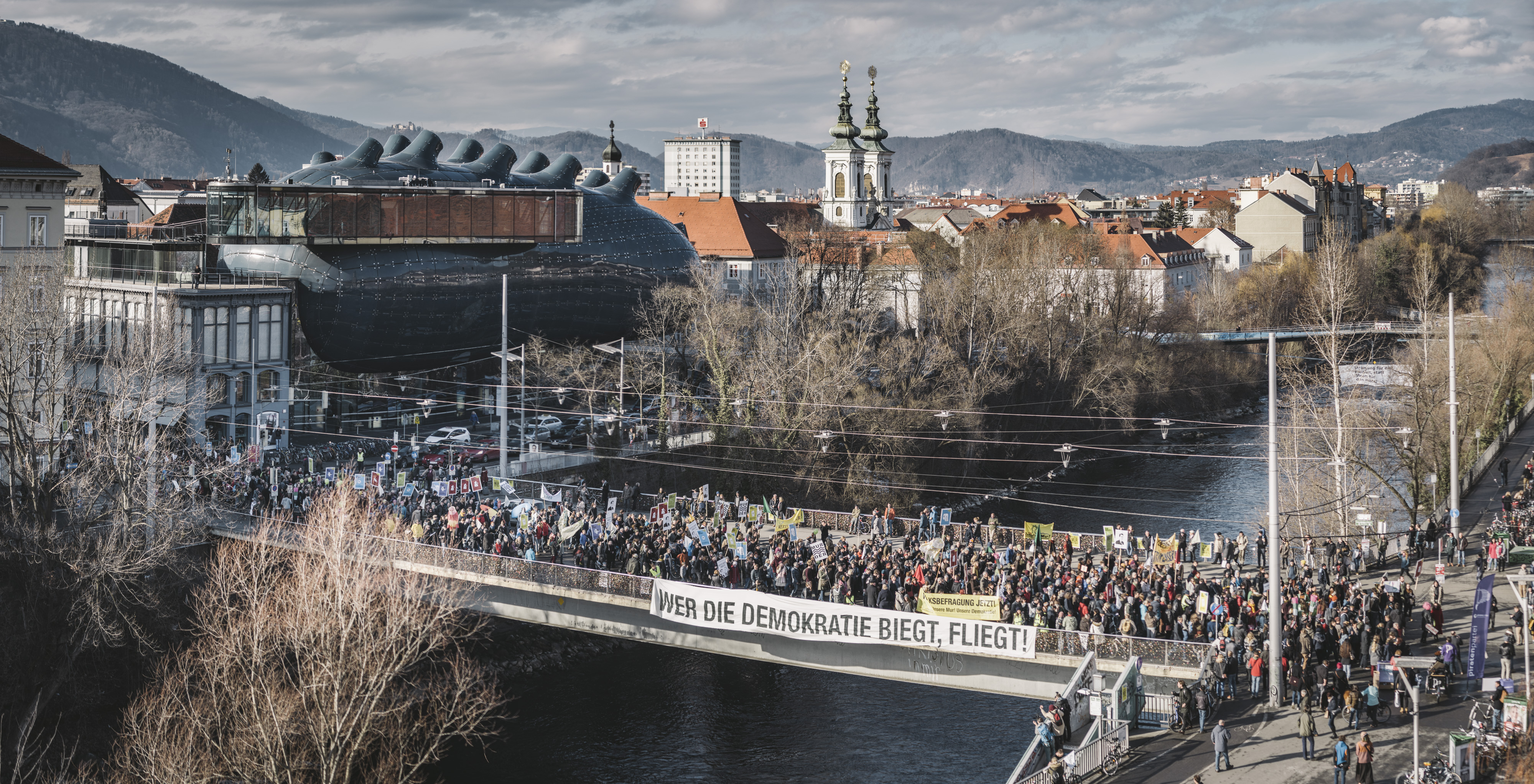 Der Protestzug beginnt um 14:00 beim Südtiroler Platz. „Murkraftwerk abwählen“ steht auf den zahlreiche Plakaten der GrazerInnen. Das Highlight des Marsches ist die Überquerung der Hauptbrücke. Hier wird ein riesiges Transparent entrollt: „Wer die Demokratie biegt – fliegt!“ ist darauf zu lesen. Auch damit werden die bevorstehenden Wahlen hervorgehoben.