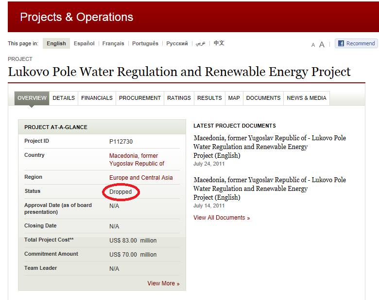 Am 4. Dezember 2015 hatte die Berner Konvention (eines der wichtigsten Naturschutzübereinkommen in Europa) die mazedonische Regierung aufgefordert, alle Bauprojekte im Mavrovo Nationalpark zu stoppen und eine umfassende Umweltprüfung vorzulegen. Die Empfehlungen richteten sich auch an die internationalen Geldgeber der Kraftwerksprojekte, allen voran Weltbank und EBRD.  „Der Bau von Wasserkraftwerken im Mavrovo Nationalpark steht in völligem Widerspruch zu den Schutzzielen, deshalb gehen wir davon aus, dass die Prüfung zum endgültigen Stopp sämtlicher Projekte führt und der Rückzug der Weltbank aus dem Projekt Lukovo Pole nur der Anfang ist“, sagt Gabriel Schwaderer.
