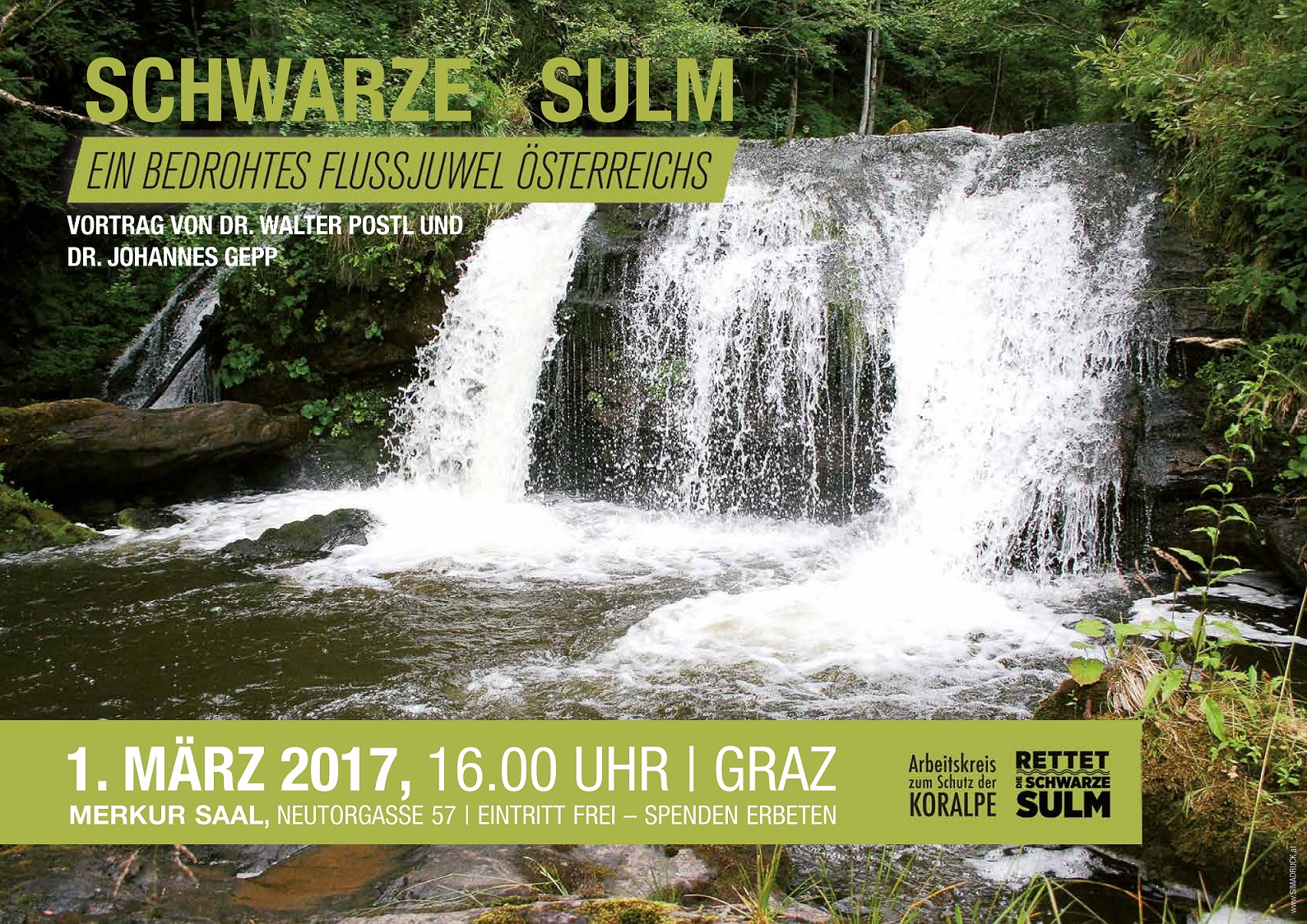 Der "Arbeitskreis zum Schutz der Koralpe" (Obmann Franz Zirngast) und die Plattform "Rettet die Sulm", sowie viele weitere Organisationen, setzen sich seit vielen Jahren für die Erhaltung der Schwarzen Sulm ein, die über 20 km den unberührtesten Gebirgsfluss der Ostalpen darstellt und mit der hochwertigsten Schluchtstrecke auch Lebensraum für seltene Tiere und Pflanzen bietet - ein Europaschutzgebiet und Fluss-Heiligtum.