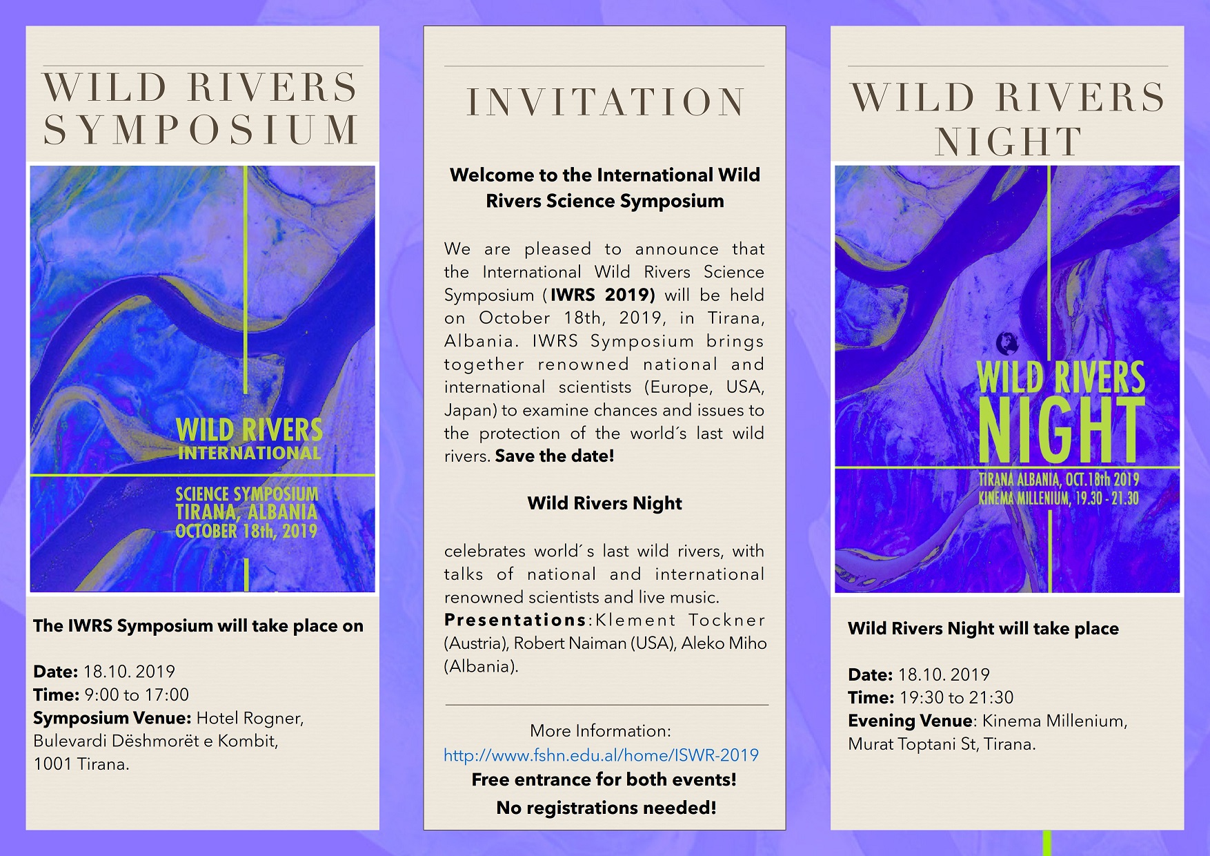 SAVE THE DATE: One day - two events for free rivers! We are pleased to announce the International Wild River Science Symposium and the Wild Rivers Night in Tirana/Albania on October 18th, 2019.