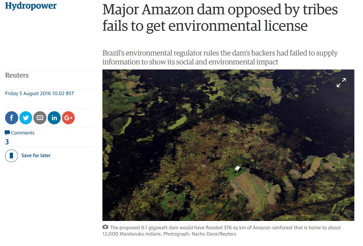 Good news: the hydroelectric dam on the Tapajós river in the Amazon now officially does not get the environmental licence because of social and environmental concerns!