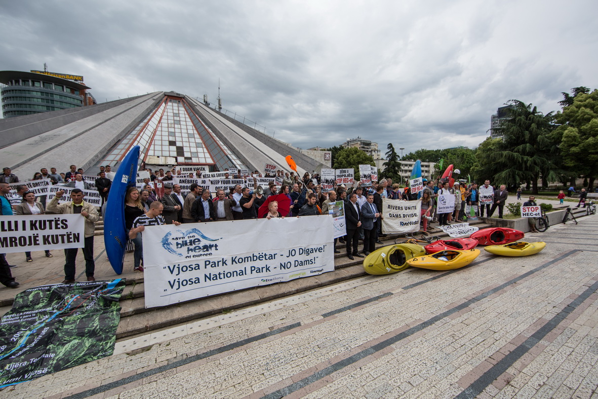 • The protest was part of the Balkan Rivers Tour: over 35 days, kayakers from various countries are paddling the most stunning and most threatened rivers in the Balkans in order to draw attention to the imminent dam tsunami. Led by former Slovenian Olympic athlete Rok Rozman, the tour started on April 16 on the Sava in Slovenia and will end on May 20 in Tirana/Albania.