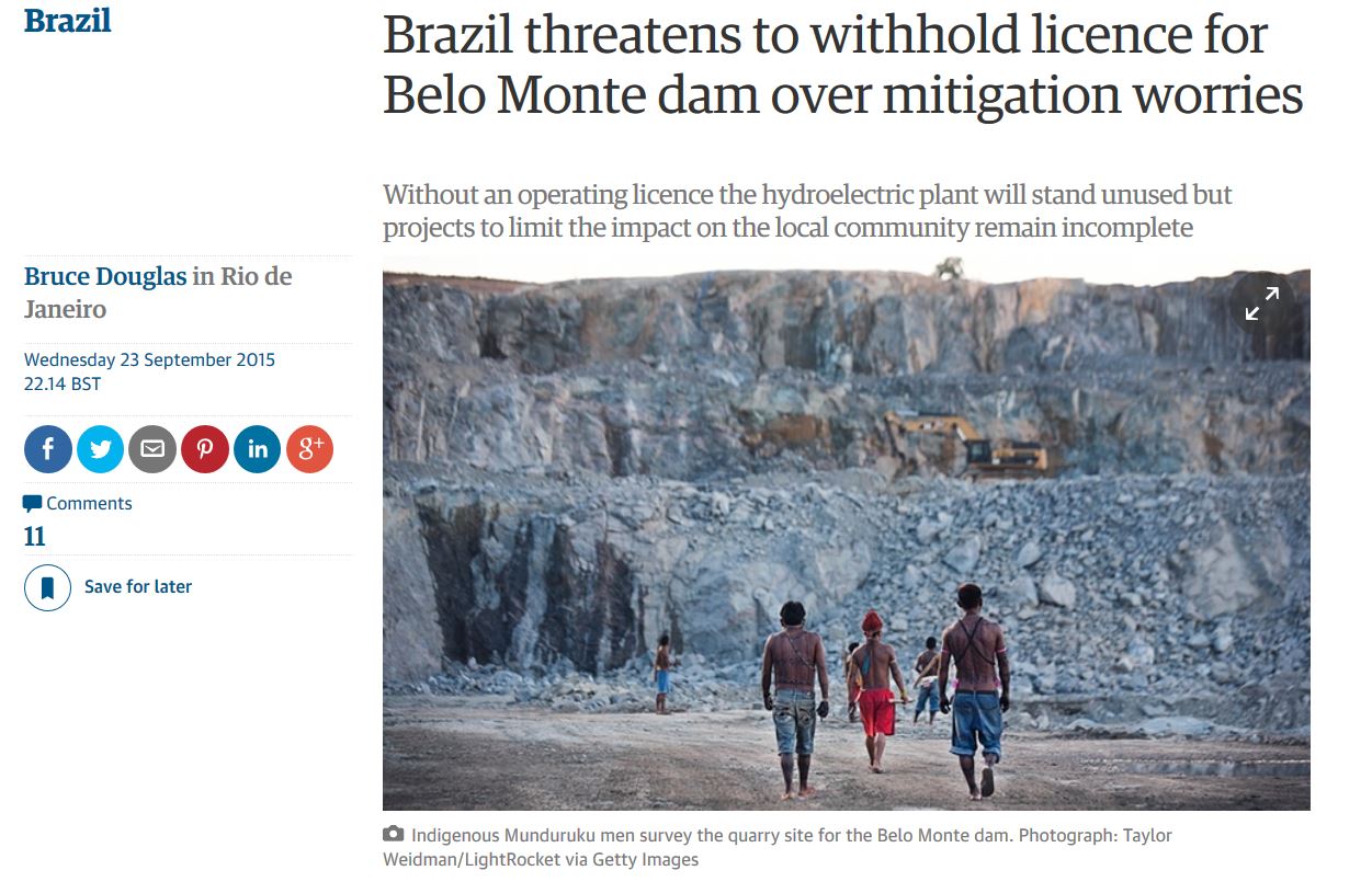 Find the complete story on the Guardian: Brazil threatens to withhold licence for Belo Monte dam over mitigation worries